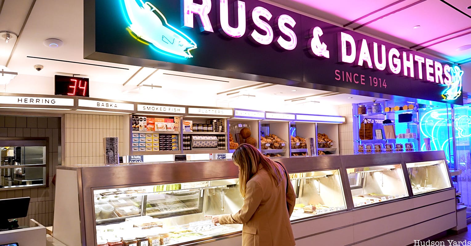You’re standing in the middle of Hudson Yards. It’s shiny. It’s glass. It feels a little bit like a space station designed by someone who really loves high-end malls. And then, tucked into the base of 50 Hudson Yards at 502 West 34th Street, you see it: the glowing neon of Russ & Daughters Hudson Yards.
